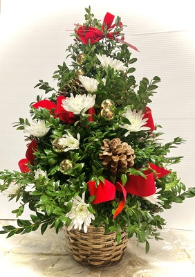Decorate your table this year with our festive boxwood tree. Trimmed with red ribbons, Christmas balls, pinecones and pom pons, this tree is the merriest decor in the perfect size!